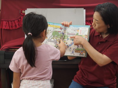 絵本を見ながら危ない人や危ない場所の特徴やヒントを教えてもらい