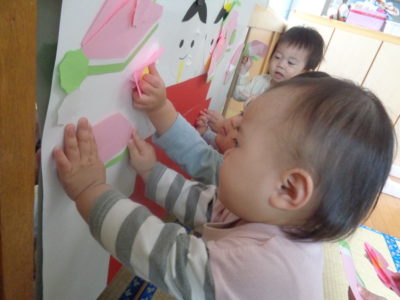 桃の花などを上手に一生懸命貼っていましたよ!