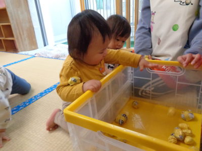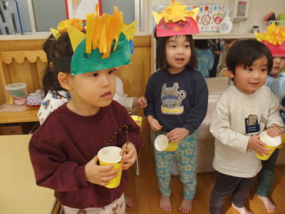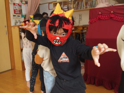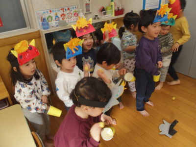 鬼を退治しようと必死に「おにはそと~~!」と頑張って鬼を追い払うお友だちの姿も見られました😊