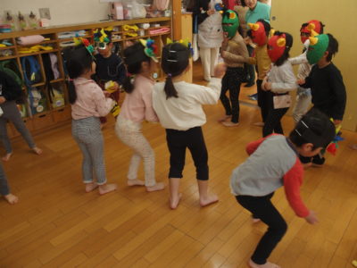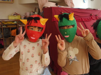 2~5歳児クラスはそれぞれ作った鬼のお面を被って集まりました!