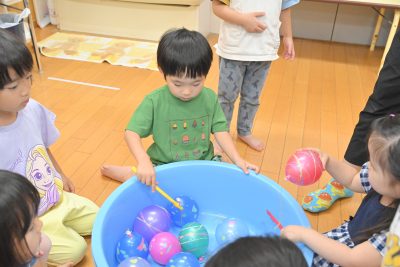 ヨーヨー釣りは2,3歳クラスもお部屋で行い、釣れると「ポン、ポン…」とヨーヨーをつくことに真剣な様子で挑戦する子もいました😊