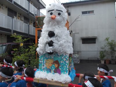 今年の5歳児のお神輿は、「アナと雪の女王」からオラフと、ドラゴンボールの神龍(シェンロン)をモチーフにして作成しました!