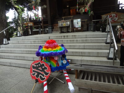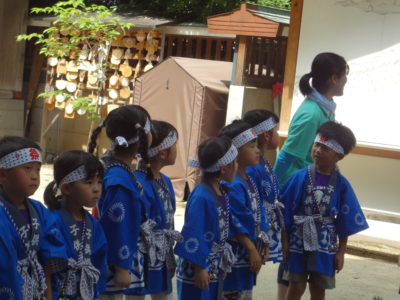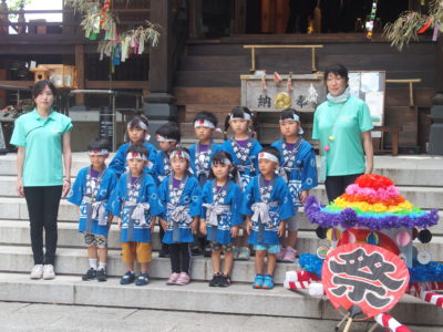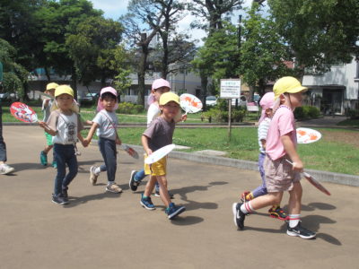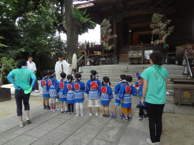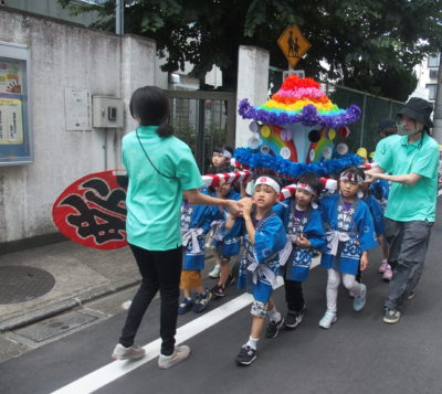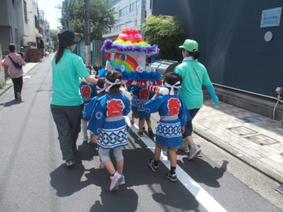 その後ろをきりん組、ぱんだ組さんも手作りのうちわを持ちながら応援して一緒に戸越八幡神社まで行きました!