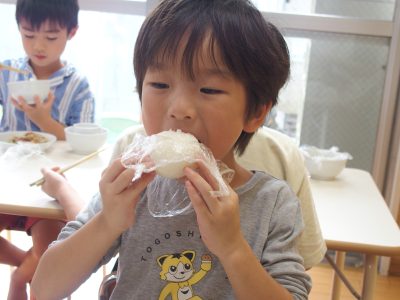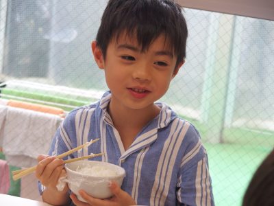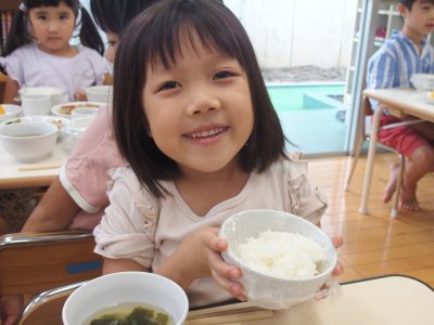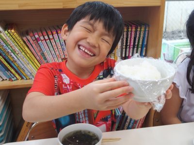 お茶碗にご飯をよそってもらうと「おいしそうなにおいがする」「いいかおり~」と嬉しそうな子どもたち!