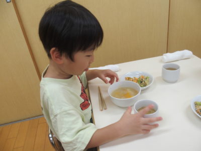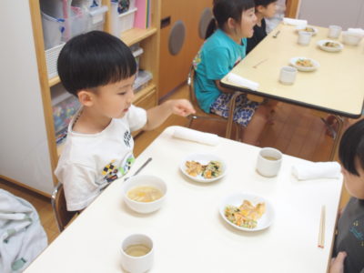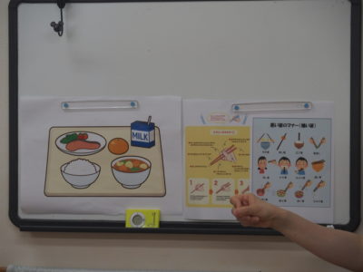 9月11日(木)食具の使い方(お箸の持ち方・マナーについて)や食器の並べ方についての食育がありました🥢